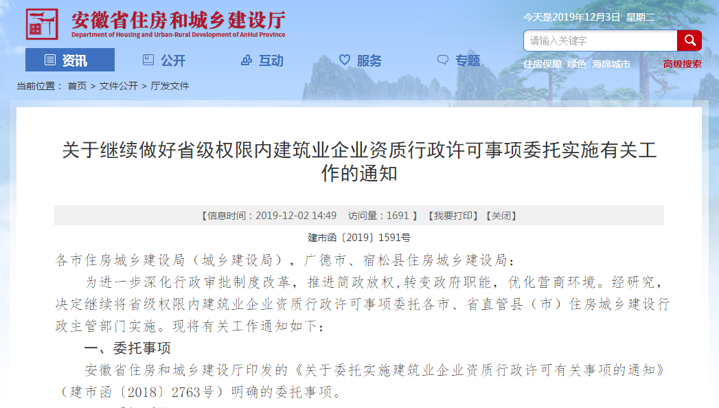 關(guān)于繼續(xù)做好省級權(quán)限內(nèi)建筑業(yè)企業(yè)資質(zhì)行政許可事項(xiàng)委托實(shí)施有關(guān)工作的通知(2019-12-3)